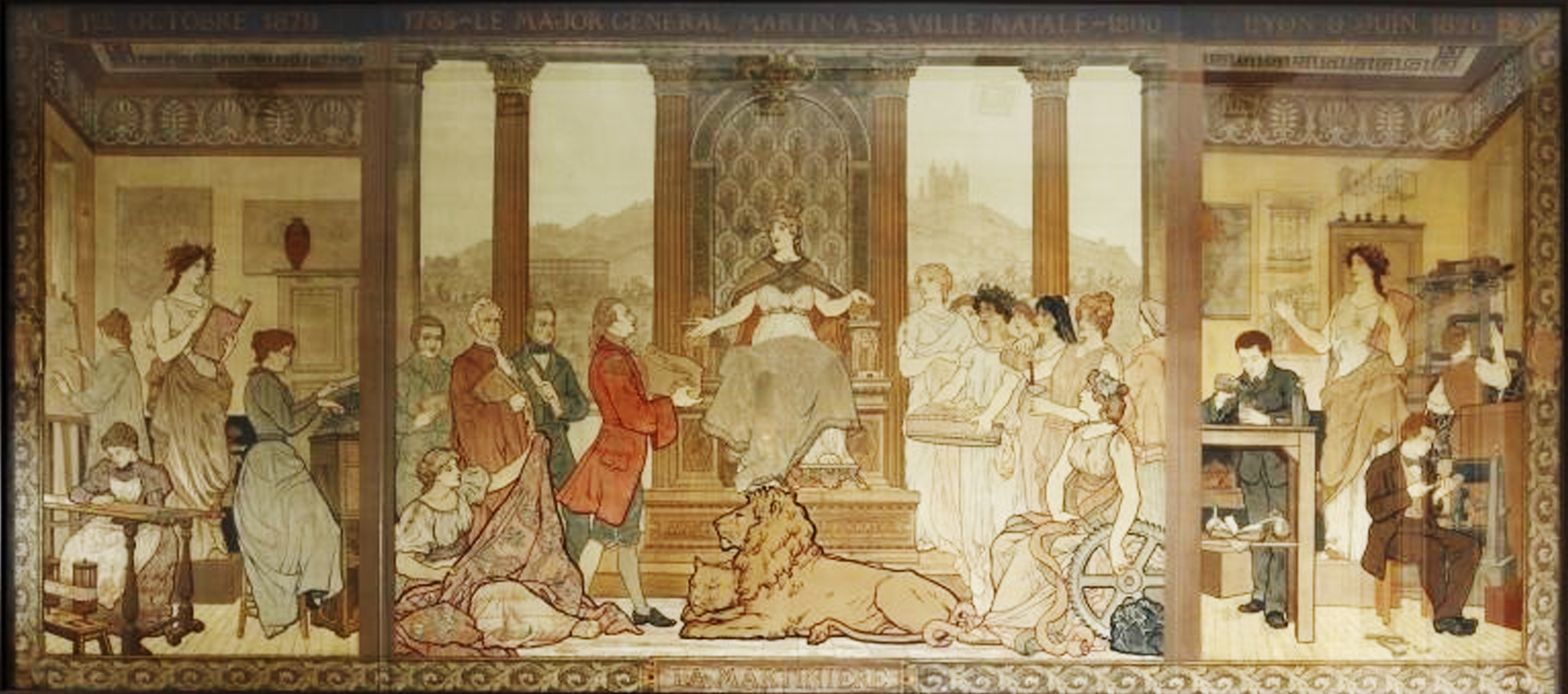The symbol of the city-a lion is seated in the foreground. Claude Martin is depicted with the directors and teachers of the Institution. The panel also contains an allegory of the arts linked to the industry of Lyon. In the background there is a view of the hill of Fourvière.
