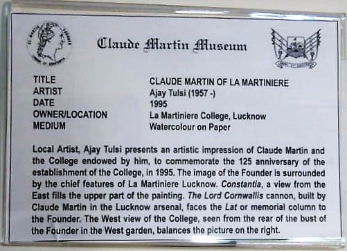 Local Artist, Ajay Tulsi presents an artistic impression of Claude Martin and the College endowed by him, to commemorate the 125 anniversary of the establishment of the College, in 1995. The image of the Founder is surrounded by the chief features of La Martiniere Lucknow. Constantia, a view from the East fills the upper part of the painting.