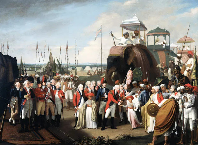 The painting records the aftermath of the Treaty of Seringapatam, when Lord Corvallis received the sons of Tipu Sultan as hostages. Claude Martin, as an aide de camp to Cornwallis was bound to have been present.