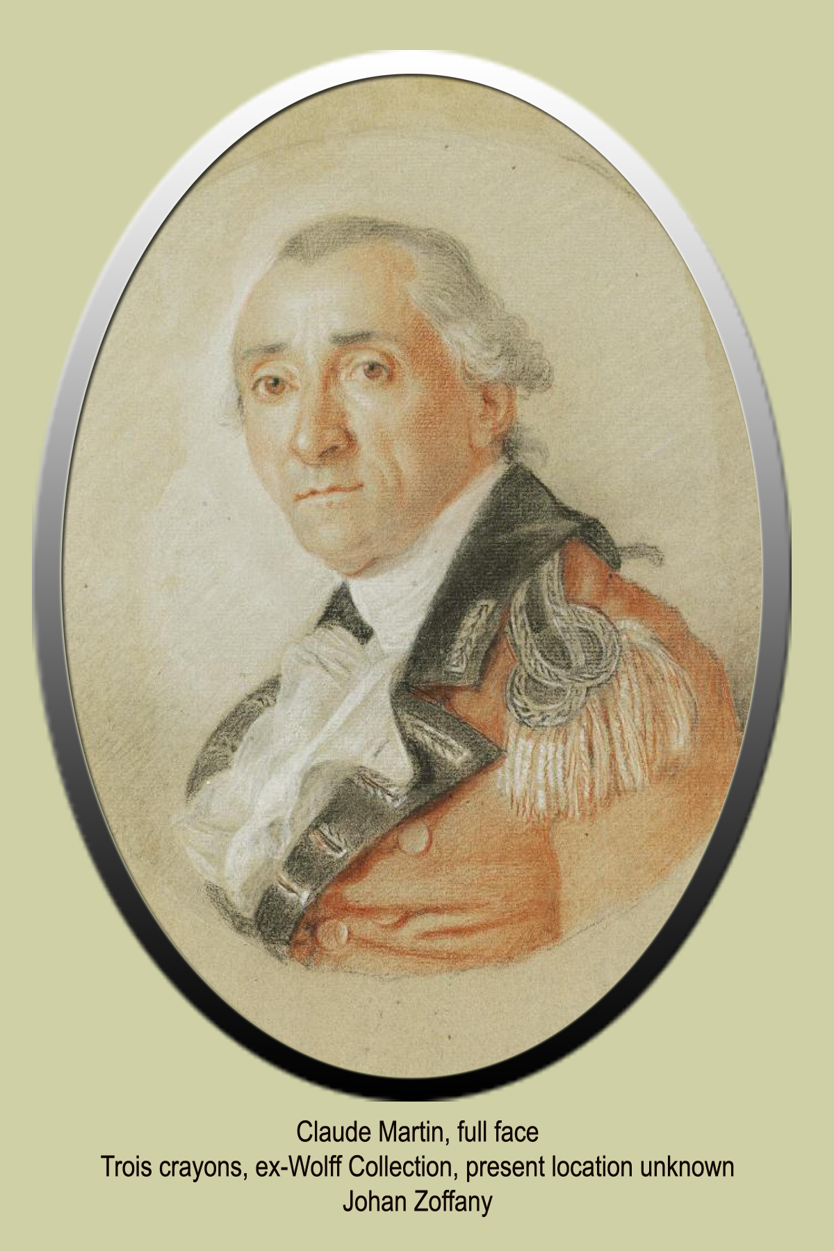 In Wolff's Album we have two portraits of Claude Martin - the portrait in profile bearing Zoffany's comment "This I Find Of Wery Leick". These may have been executed during his stay with Martin in Lucknow or more likely in England and after studies from India.