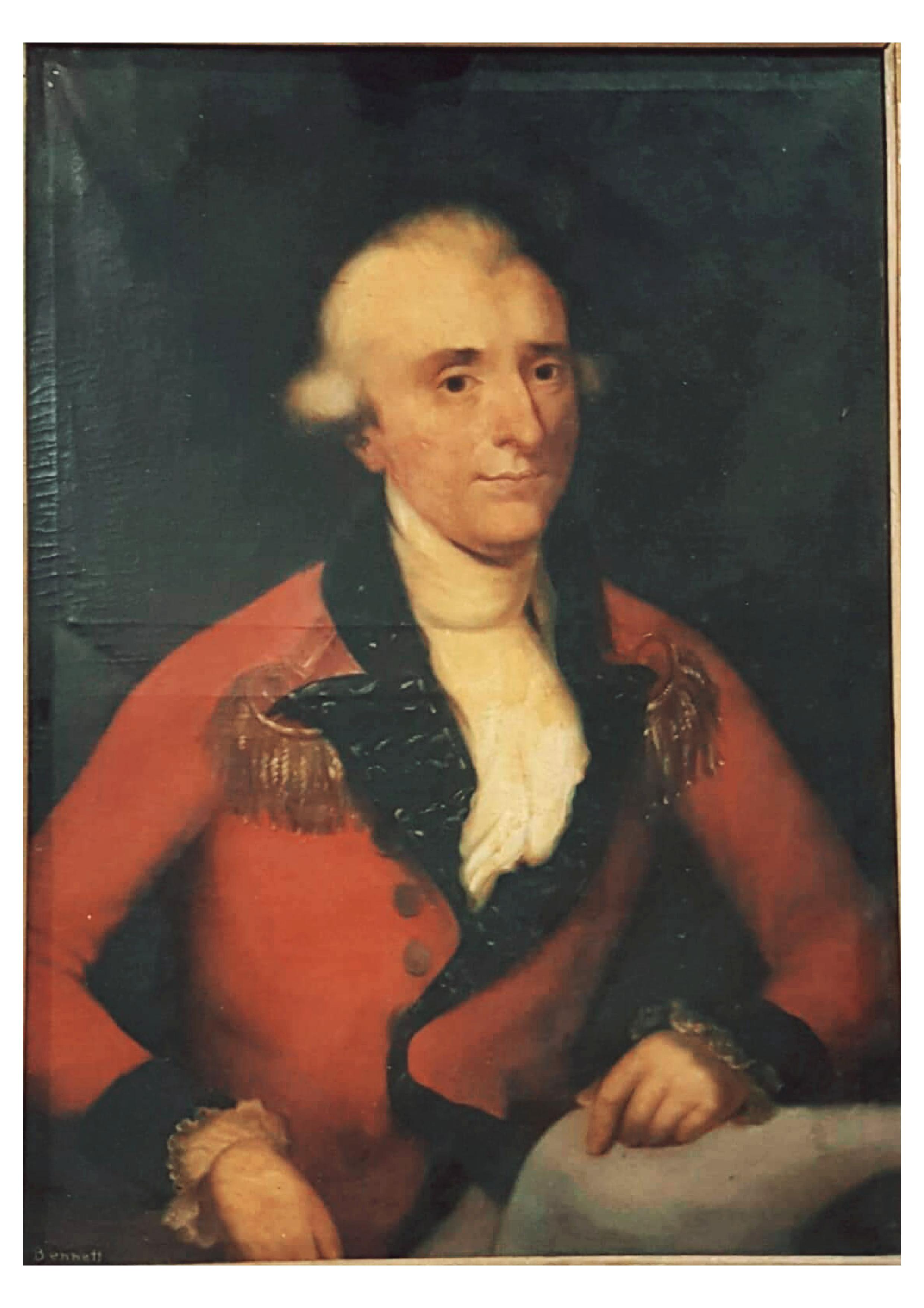 M. Chaterjee version - The likeness of Maj. Gen. Claude Martin is based on the portrait of the Founder, painted during his lifetime by Francesco Renaldi. In 1966, local artist M. Chatterji was commissioned to copy the Renaldi portrait for the sum of Rs 250/-. This has since been displayed in the College Auditorium, Spence Hall.