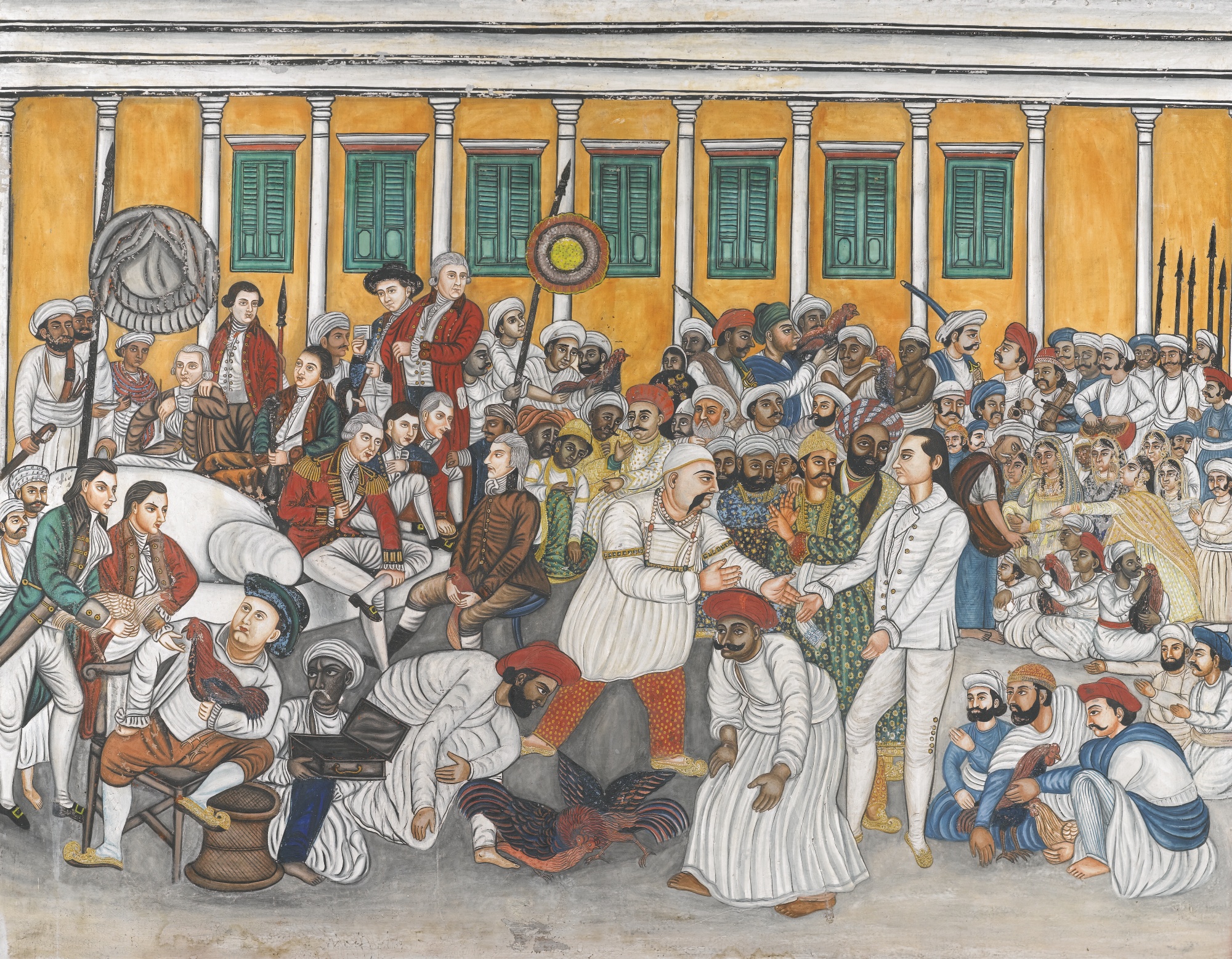 A cock-fight of birds of Nawab Asaf-ud-Daula and Colonel John Mordaunt, HEICS. Around ninety figures can be identified. Claude Martin, in a red uniform, is seated on the settee. The picture Includes dancing girls, musicians, a water-carrier and an elephant in the distance. Zoffany, is in the background, in white evening wear.