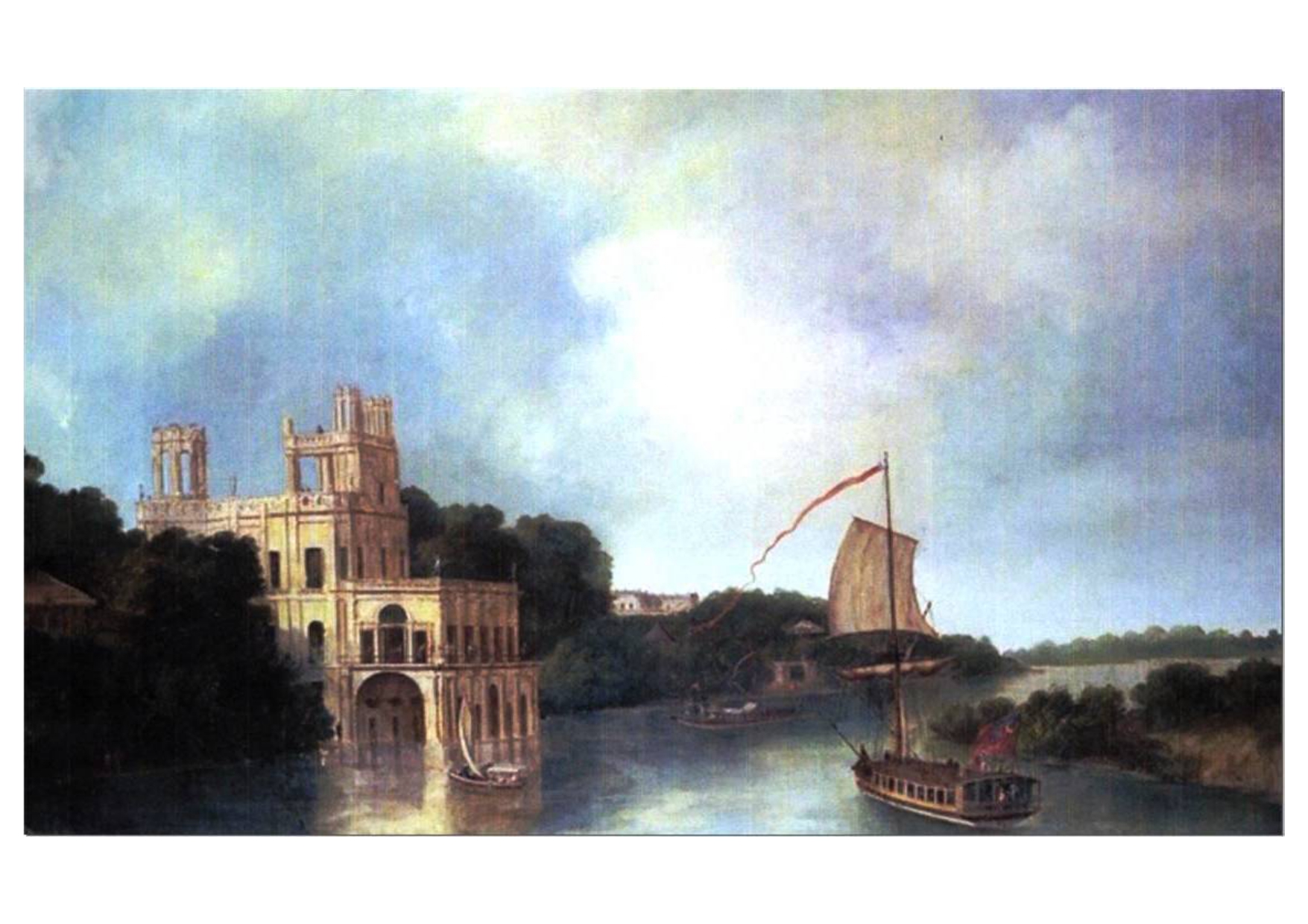 The painter, using artistic license, depicts Claude Martin in three different positions in the same painting. Claude Martin, dressed in red, is seen on the balcony of the building issuing instructions. He is seen in the boat pointing with his right hand, while his left hand controls the rudder. He is seen at leisure on the deck of the barge, with a retinue to attend him.